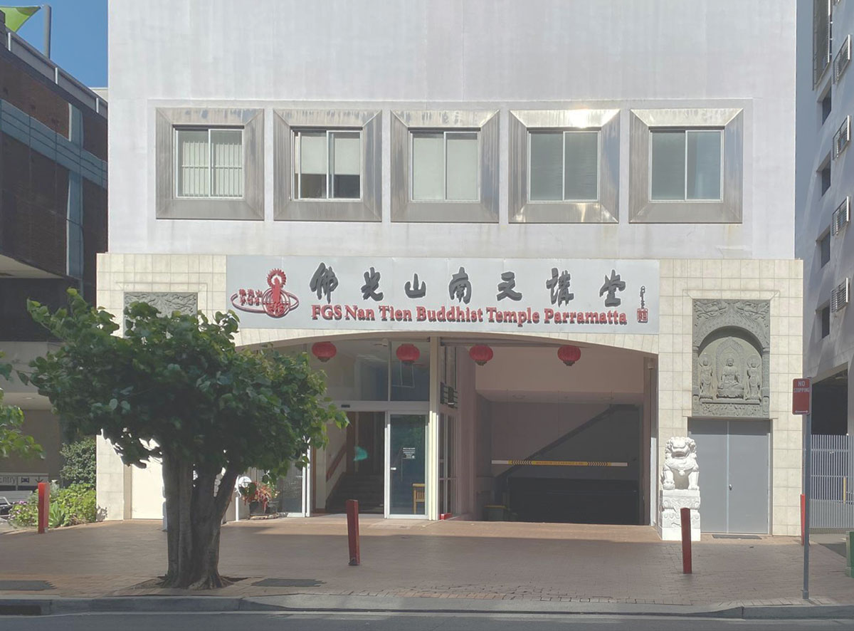 南天講堂1991年4月8日 澳洲首座佛光山寺院南天講堂開光落成典禮,位於澳洲第一大都市-雪梨以西的Parramatta區,距雪梨巿中心約40分鐘車程,是雪梨地區信眾的「老家」,也是雪梨地區活動的中心。「南天講堂重建落成開光典禮」2000年11月18日下午舉行,恭請星雲大師主持,有澳洲聯邦移民部部長Philip Ruddock、國會議員Ross Cameron、市議員Mr. David Bonger、國際佛光會世界總會急難救助基金會執行長廖德培、雪梨文教中心汪樹華主任等1600人與會。移民部部長Ruddock致詞表示,佛光山在雪梨所做的貢獻是有目共睹的。 南天講堂佔地330坪,建築面積780坪,有地下停車場,一樓為服務台、會客室、教室、五觀堂、雪梨協會及中華學校辦公室,二樓為如來殿、抄經堂、圖書館及教室等。