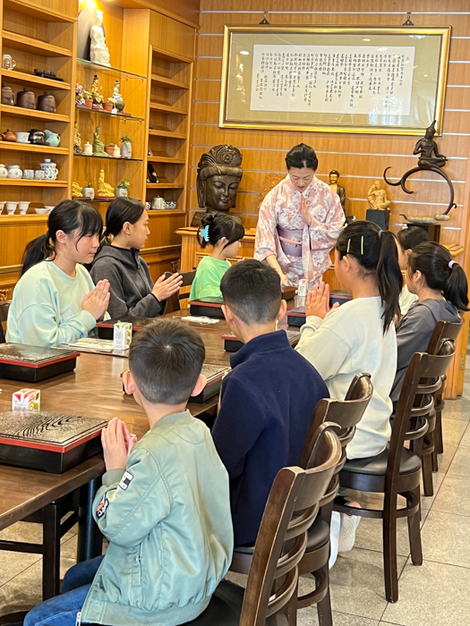 | 體驗營安排老師與小朋友一起享用日本餐盒「禪饗午餐」,並帶領學生至佛殿拜佛及學習吃飯禮儀,同時說明需要用清淨心與感恩心,體會不同食物帶來的各種感受,更需要學習感恩惜福惜緣。 |