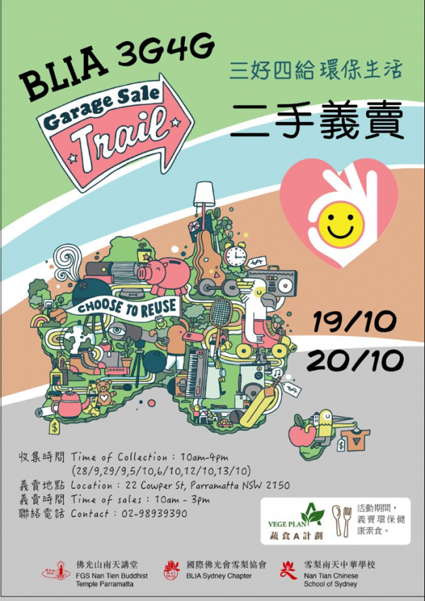 為配合新南威爾士州“Garage Sale Trail”活動,佛光山南天講堂將在19/10 & 20/10從上午10點至下午3點在Parramatta進行為期兩天的「三好四給」二手義賣活動。