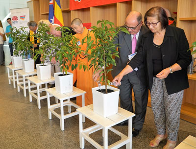 圖說: 佛光山澳紐總住持滿可法師(右三)、臥龍崗市長Gordon Bradbery(右四)、國際佛光會雪梨協會會長黃勁鋒(左一)及其他宗教代表,為將植在南天寺後山的樹苗澆水,共同推動環保愛護環境。