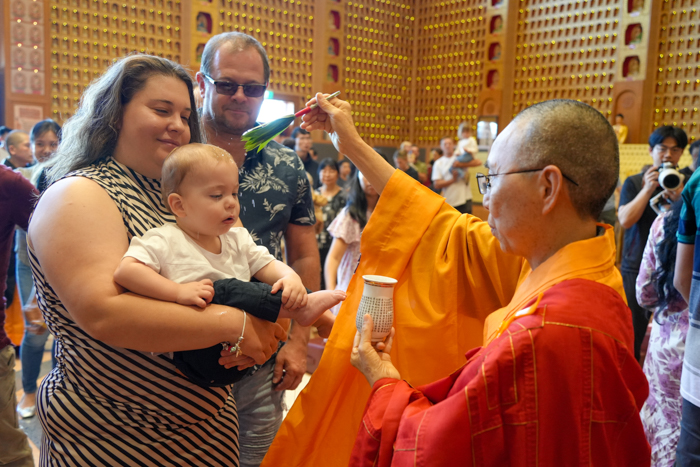 | 慶祝佛陀聖誕,佛光山南天寺3月30日在大雄寶殿為51名中西方寶寶進行「毓麟祈福典禮」,恭請南天寺監院覺寧法師主法,近200位家長及親友共同見證。 |