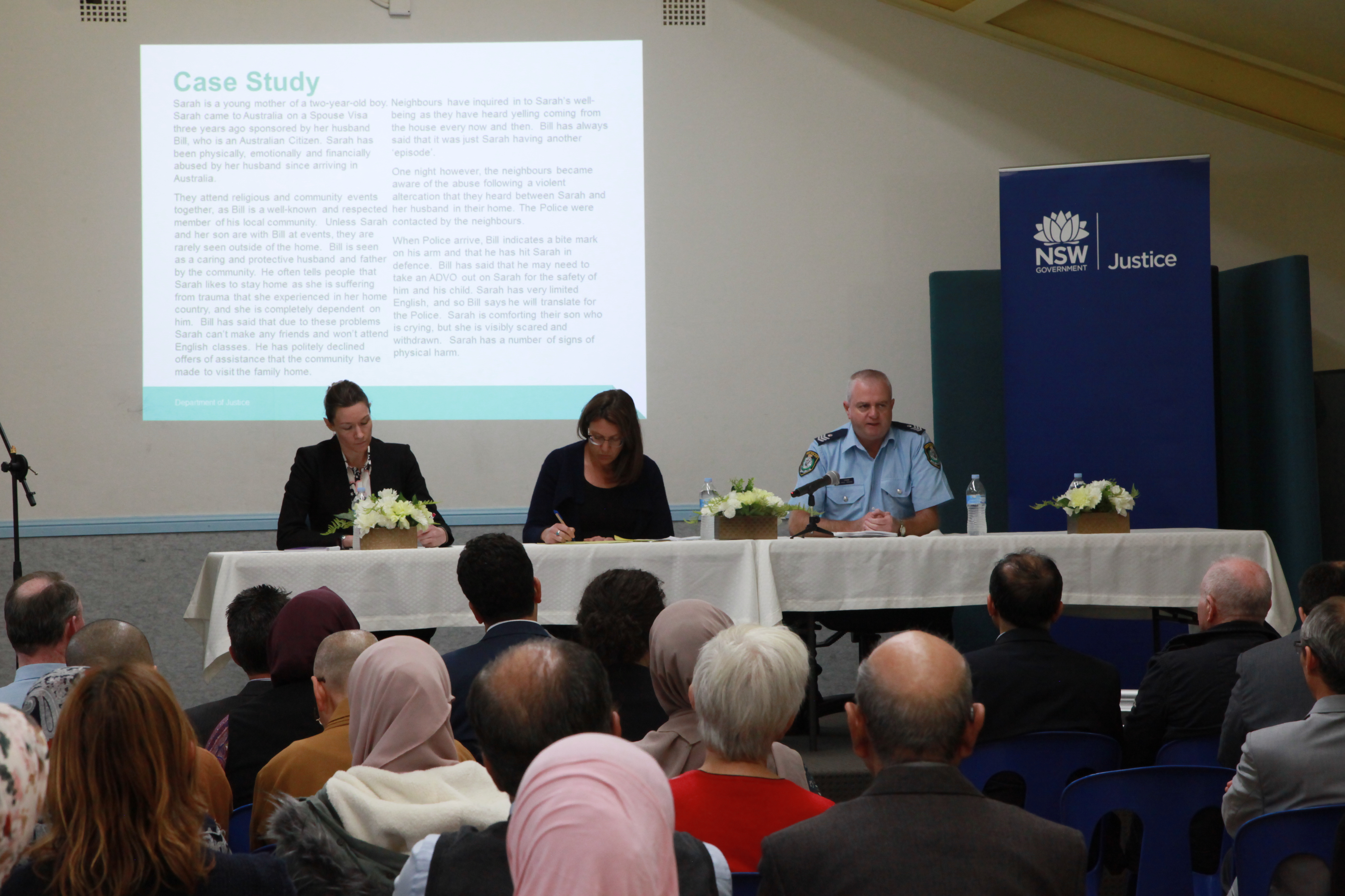 本次研討會針對如何制止家庭暴力,旨在為宗教和社區領袖提供:一、關於受害者和罪犯相關支援途徑的指導;二、家庭暴力報告後有關法律程式的資訊; 三、提高領導者獲得法律和服務資訊的機會及提供對家庭暴力資源的訪問訊息等。 首先邀請臥龍崗大學原住民知識學術開發講師Jade Kennedy致詞「歡迎來到這個國家」,並特邀曾在新南威爾士州公共服務部門從事33年,擔任教育和培訓部高級主管20年的謝爾哈伯市議員(Shellharbour)John Murray、Yasmin Hunter與Matthew警官分別為本次主題致詞。 之後,主持人就現場提供的一個典型家庭暴力案例,邀請3位與談人:法律援助部Eliza律師、員警部Paul警長、受害者服務部Natalie,就部門的職能分別做相關的法律與服務資訊介紹。 |
