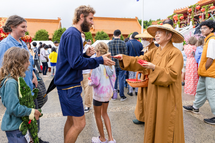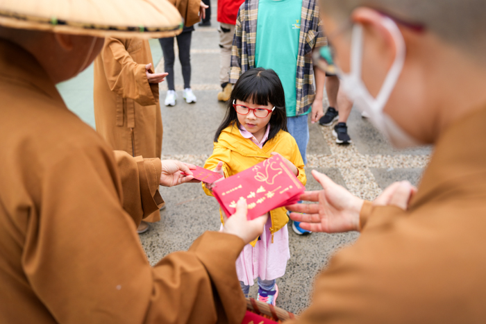 | 「紅包」亦是傳統文化之一,佛光山澳紐總住持滿可法師,新春期間派送紅包給來山大眾,紅包內放有星雲大師法語書籤,寓祈福於開啟智慧,學習和體驗佛法。渴望領取紅包的人潮長龍、耐心的在丹墀排隊等候。 |