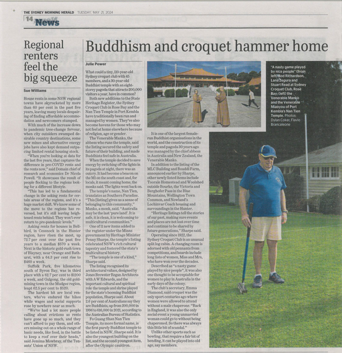 | 欣逢佛光山南天寺30週年,澳洲新南威爾斯州政府認可南天寺是澳大利亞佛教建築和景觀的傑出範例,展示了20世紀末,佛教在澳大利亞的發展,也是作為1970年代後,非基督教宗教在新南威爾斯州增長的證據,具有歷史意義,將南天寺列入澳洲「新南威爾斯州文化遺產名錄」 (New South Wales State Heritage Register) ,雪梨主流英文報紙「雪梨晨鋒報」 (Sydney Morning Herald) 5月21日大篇幅詳細報導。 |