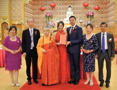 南天講堂為一對新人佈置得一片喜氣,佛前紅燭高燒,如來殿紅燈高掛,長長的紅地毯從大殿門口一直鋪到佛前。婚禮在上午10時30分舉行,新郎新娘在雙方家長引領下,喜洋洋地攜手走進大殿,恭立佛前,由總住持證婚;一對新人在佛前向對方表達忠誠和發表「愛的宣言」,隨由總住持宣佈兩人結為夫婦,交換信物。在莊嚴和喜氣交織中,新夫婦、雙方家長及證婚人在婚書上簽字。