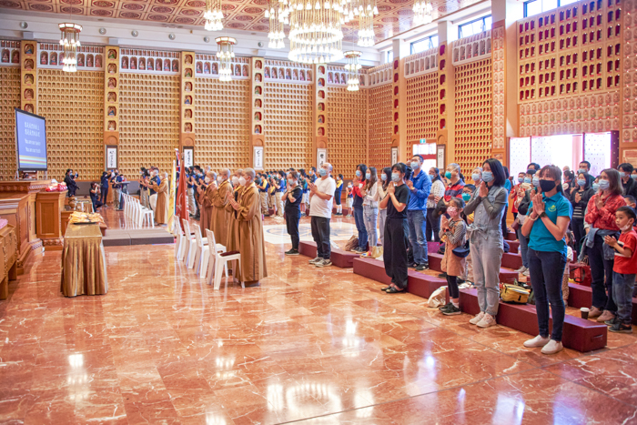 | 適逢「2022佛光山南天寺佛誕節多元文化慶典」,4月17日雪梨佛光童軍授證典禮由雪梨西區佛光童軍承辦,恭請佛光山大洋洲總住持滿可法師與地區專員Tracey Hansford,在南天寺大雄寶殿為3位童軍領袖與35位幼童軍授證,加入雪梨佛光童軍大家庭,讓幼苗在正信健全的環境下成長茁壯;雪梨佛光童軍輔導法師如儀法師、妙堯法師、如定法師、南天寺妙哲法師、雪梨佛光童軍主席胡命安、總團長方婉晶、各區輔導法師及家長等近80人出席,見證幼童軍授證儀式。 |