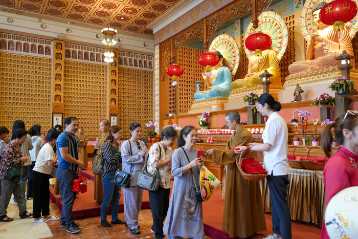 新年走春是越南寺院傳統習俗,新年期間法師帶領信眾參訪各佛教道場並祈願祝福。南天寺是他們每年必定造訪的寺院之一。虔誠的信眾們大多身著海青或越式傳統服裝隨行。除了禮佛誦經外,大家也聚集在南天寺丹墀的各個新春攤位感受節日氛圍。不少人將祈福布條拋至許願樹上,祈求新的一年龍天護佑,平安吉祥。