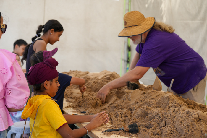 在創意沙雕藝術展區,澳洲沙雕團隊Sandology與大眾集體創作,用沙粒勾勒佛教意象。一尊2立方公尺佛陀於菩提樹下打坐的沙雕陳列在丹墀,大眾紛紛駐足觀賞,嘖嘖稱奇。藝術家以細節呈現佛陀悟道的寧靜安詳,增添慶典的莊嚴祥和氣氛。民眾亦可親手在沙雕攤位堆砌菩提葉、蓮花、佛足、法輪等,體會「一沙一世界,一葉一菩提」的真諦。 |