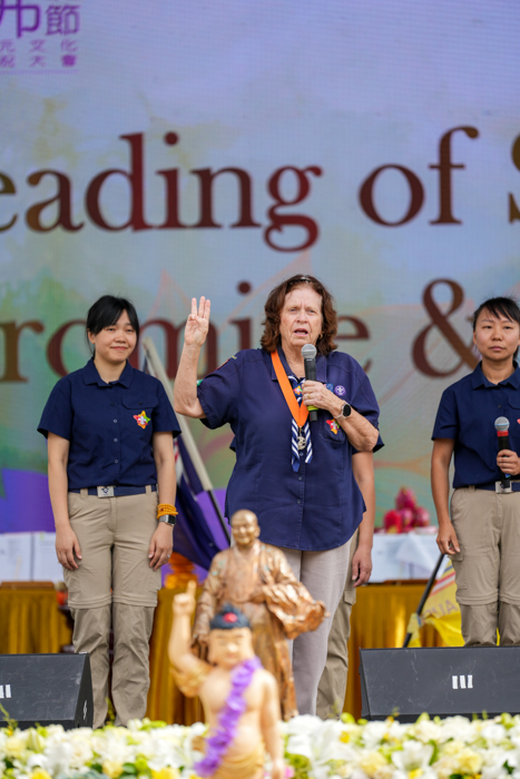 | 滿可法師歡喜看到年輕一代參與童軍團的授證,並指出佛光童軍具有正信且本土化的健全團體,童軍除融入社會,更能培育為未來領袖,保護自己、家庭和國家。總住持感謝家長們將孩子交給童軍團,在有紀律和健全的環境下茁壯成長,同時感謝專員Helen Dwyer蒞臨指導童軍授證。 |