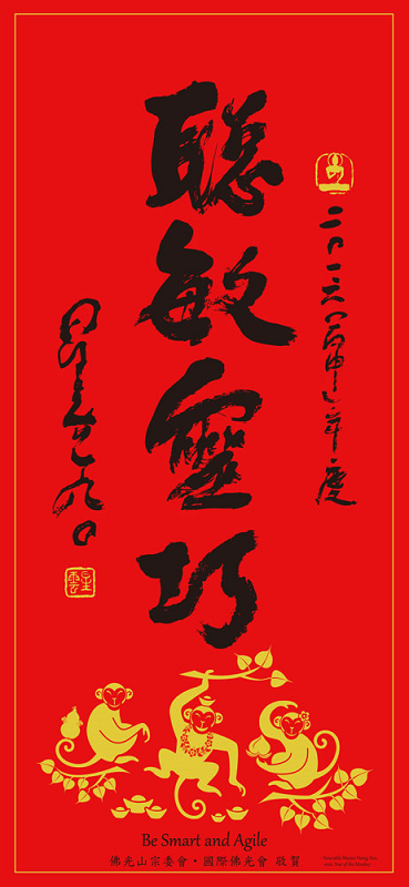 二○一六年在中國習俗所謂的「十二生肖」裡,屬於猴年。猴子很聰敏、靈巧,我們經常看到猴子玩把戲,都是這樣變、那樣變,花樣百出,給人歡喜一笑。給人歡喜是人間很重要的布施。所以這一年,希望我們所有的佛光人、世界上的有緣人,都能聰敏靈巧,像孫悟空一樣上天入地,所謂「神通廣大」、「法力無邊」;希望各位有緣人,都能發揮自心自性裡的力量,像猴子一樣會動、會想,把種種的靈巧發揮出來,做人就有禮貌,做事就能圓滿,將來一切平安順利。非常祝福你們!