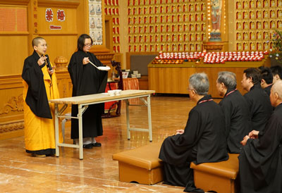 230位戒子們來自雪梨及墨爾本,在11日下午2時許陸續抵達南天寺,報到安單後,便在大雄寶殿排班晚課,並學習殿堂禮儀和過堂規矩等。