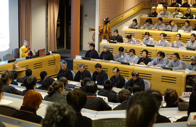 南天寺覺諦法師亦為大眾講述「人間佛教在澳洲」,介紹佛光山在澳紐的各地道場和國際佛光會對社區慈善事業的參與,包括對雪梨地區藍山大火和紐西蘭基督城大地震的賑災、澳洲清潔日推行心靈環保和Meals on Wheels送餐服務等。他說,佛光山的澳紐道場,更是大眾的「心靈百貨公司」,提供多元多樣的宗教和教育活動,包括浴佛節、南天文藝季、三皈五戒、短期出家、禪修班、佛學班,更有青年生命成長營、甚至南天佛學院、南天大學等,讓大家學習感恩、歡喜、正念、反省和懺悔,為心靈補給精神食糧。佛光道場更是培育聖賢的學校,讓大家學習智慧慈悲。