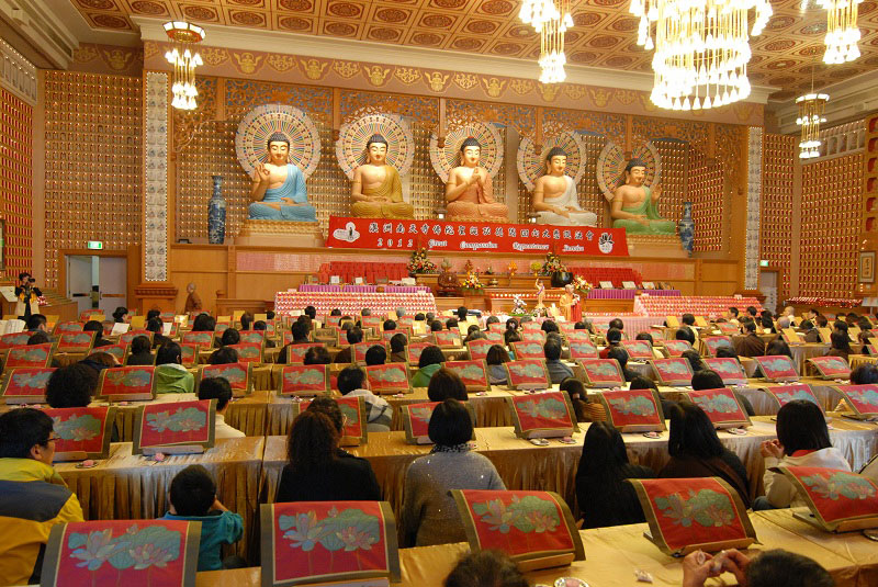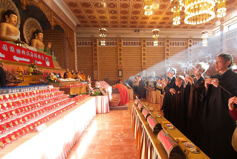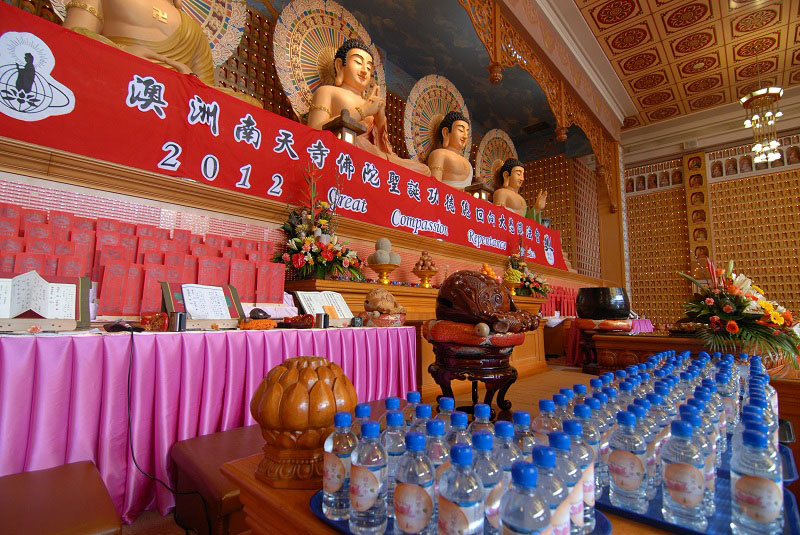 | In our daily lives, when our clothes become dirty, we wash them with water. When our minds are polluted by greed, anger, and delusion, we become worried and troubled. In Buddhism, devotees practice repentance to cleanse their minds, and rid themselves of worries. There are different repentance ceremonies, with the Great Compassion Repentance Service being one of the most popular. The Great Compassion Repentance Service is based on the Great Compassion Mantra. The full name of the Great Compassion Mantra literally means, “Thousand-arms and thousand-eyes Avalokitesvera Bodhisattva’s all embracing great compassion Dharani.” The mantra consists of eighty-four phrases. It is very popular in the Chinese culture, and widely recited among devotees. Some of the merits often associated with the Great Compassion Mantra are: rebirth into higher realms, meeting beneficial acquaintances, having competent facilities, bountiful food and wealth, gaining great respect, and the opportunity to learn Buddhist teachings. Moreover, those who recite this mantra will not suffer death by starvation, disease, poison, flood, or fire. Water blessed with the Great Compassion Mantra is called the Great Compassion Water, and is taken by devotees for its spiritually cleansing qualities. Buddhists believe that faith in Avalokitesvara Bodhisattva not only improves conditions of this life, but also for rebirth into the Western Pure land. Other than gaining the above benefits, by participating in the ceremony, devotees also benefit from the strength of the compassionate vows of Avalokitesvera Bodhisattva to find peace within themselves. They learn to treat others with respect and humility, bringing harmony to their families and society. |