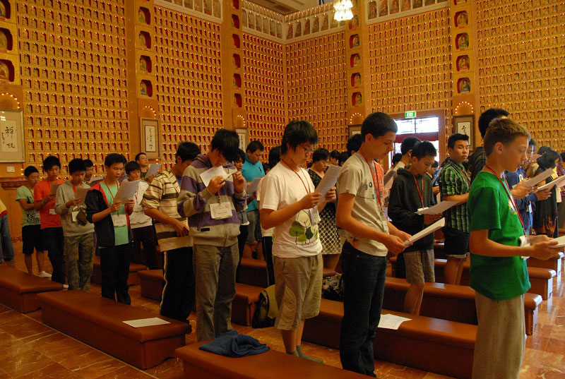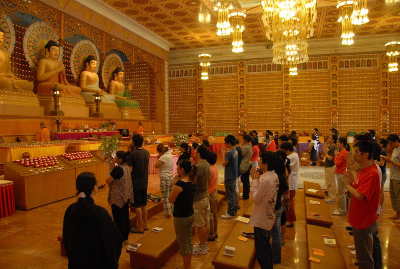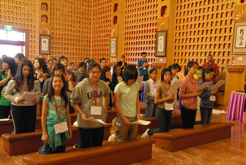 | In the Buddhist tradition, the making of an offering allows one to practice giving, to express gratitude and respect and to reflect upon the life sustaining law of interdependence. The offering of light extinguishes darkness, it symbolically represents the way in which wisdom dispels ignorance. By offering light to the Buddha, one also offers light to themselves. The Fo Guang Shan Light Offering Ceremony, involves the chanting of the Medicine Buddha Mantra, the Buddha of Healing; one of the trinity of Buddhas, the others being the founder of Buddhism, Sakaymuni Buddha and Amitabha Buddha of the Pure Land. Chanting the Medicine Buddha Mantra bestows the healing blessings of the Medicine Buddha; blessings for mind, body and soul. For good health, wisdom and emotional well-being; for themselves, their loved ones and for their neighbors, the people of the world. |